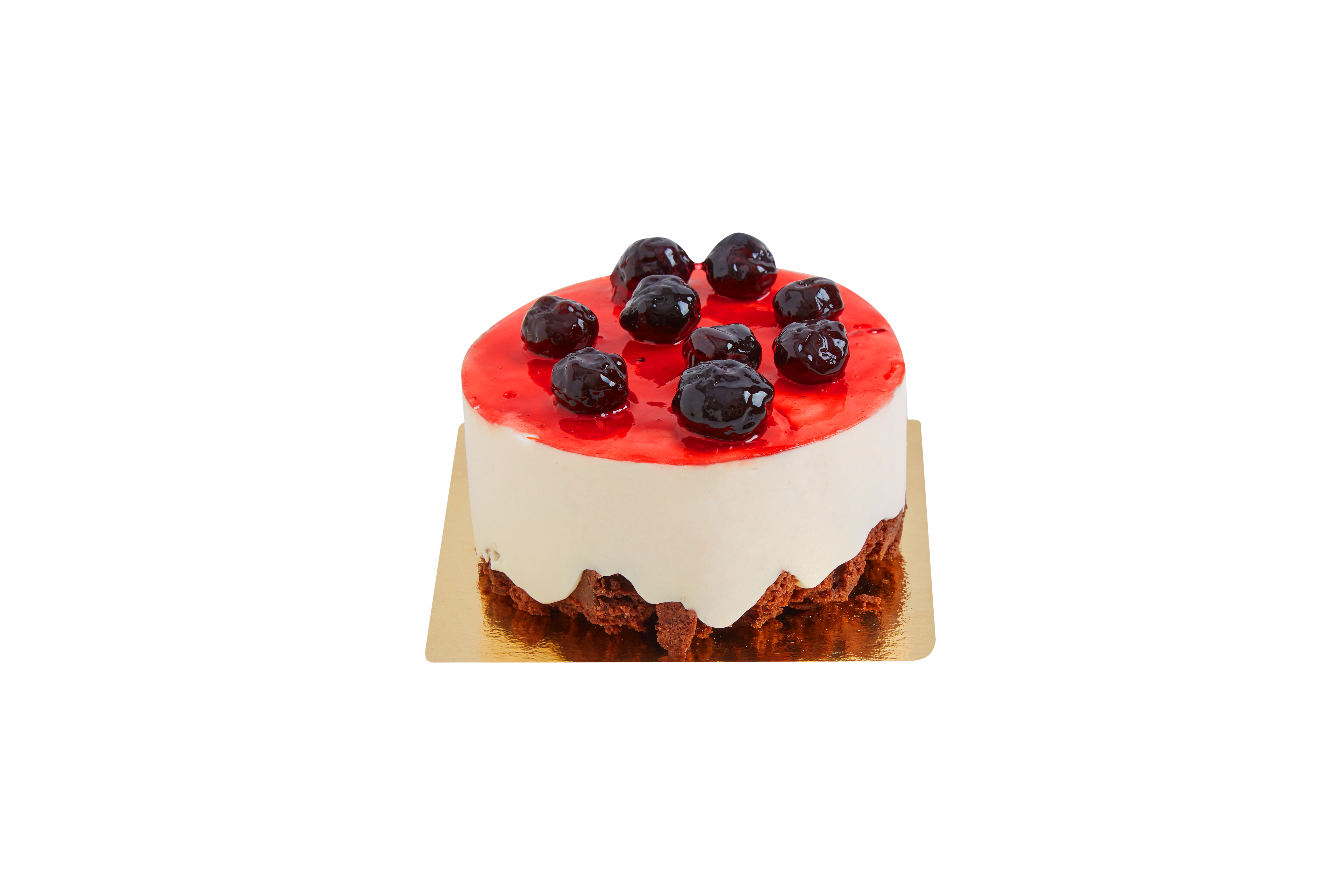 Base de brownie con nueces. Esponjoso de frutilla. Decorada con gel de frutilla y arandanos o similar.