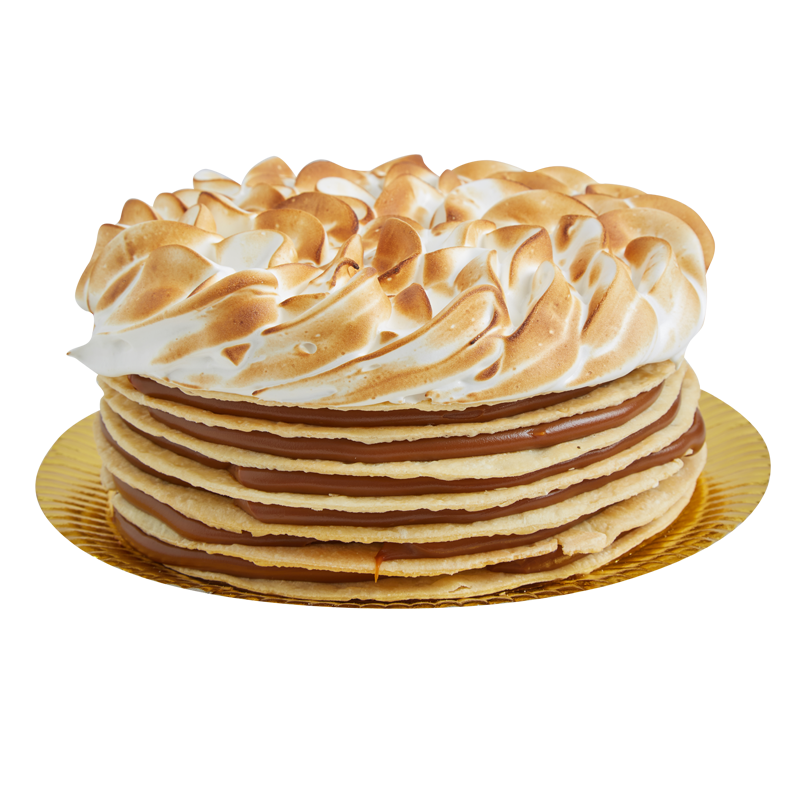 Discos de masa crocante, dulce de leche y el clásico merengue italiano.